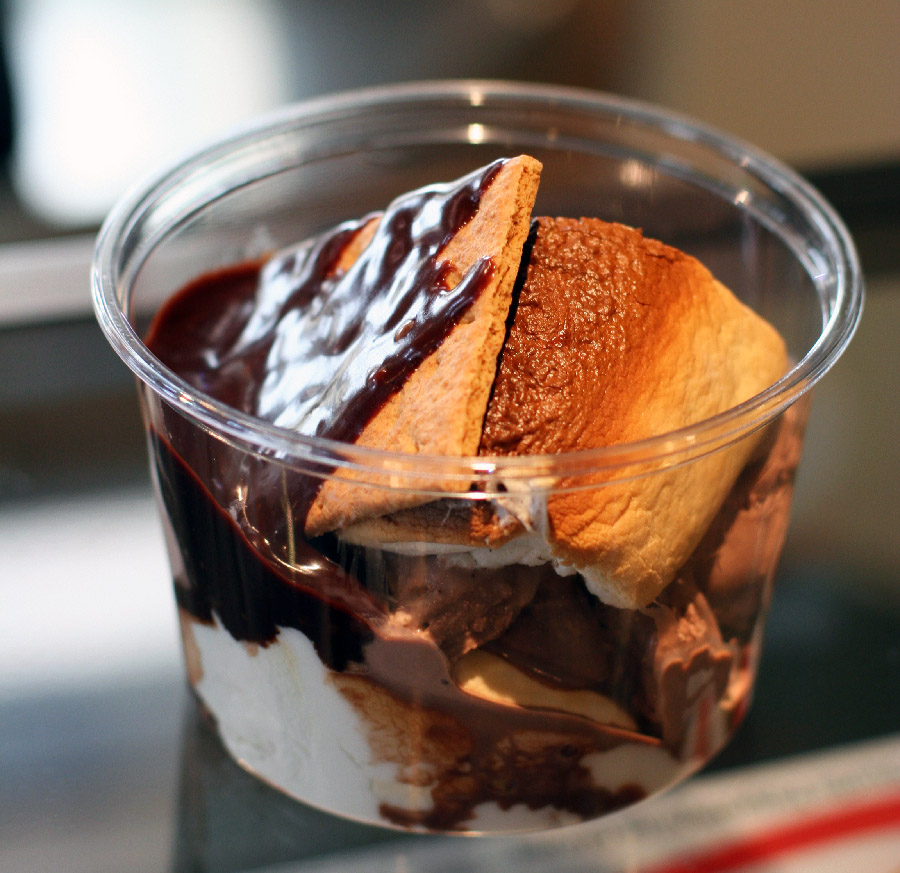 Gooey toasted marshmallows and graham crackers sandwich a scoop of chocolate ice cream, topped with hot fudge