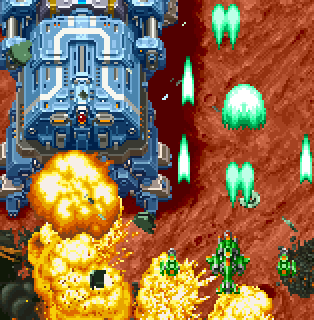 Cave's 1997 title DoDonPachi is a vertically-scrolling bullet hell shoot 'em up game. Players can pick from three different ships which can either rapid-fire by pressing the attack button repeatedly or fire a massive column of laser by holding it down continuously. It's one of the genre's best loved titles due to its frantic gameplay, sharp design, and rocking soundtrack.